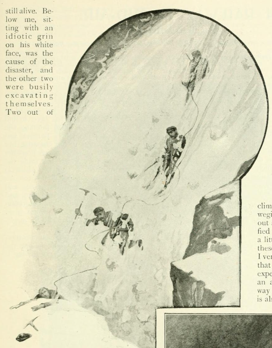 Mens de skled nedover kunne Coward høre buldrende lyder ovenfra. Snøen over dem var i ferd med å skli ut, og lydene ble til et brøl: “we were flying down upon a snow avalanche!”