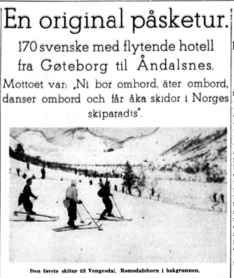 Påsken 1939 skjøt vinterturismen i Romsdalen virkelig fart. I tillegg til sunnmøringer dukket det opp over 170 svenske turister, som hadde tatt båt fra Gøteborg til Åndalsnes for å gå på ski! Den Svenske Amerika-linje satset stort på Romsdalen som skidestinasjon, og reisefører Sjøberger uttalte til Aftenposten at dette var første gang i verdenshistorien at noe slikt ble arrangert. Kanskje kan man kalle det verdens første “ski and sail”?
